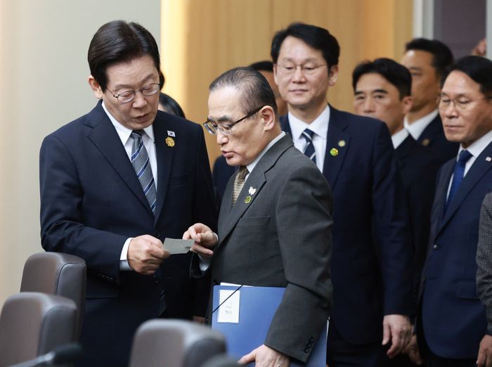 이재명 대통령이 지난달 30일 경북 경주 APEC 정상회의장에서 열린 한-베트남 정상회담에 앞서 위성락 안보실장이 전달한 메모를 확인하고 있다. ⓒ연합뉴스