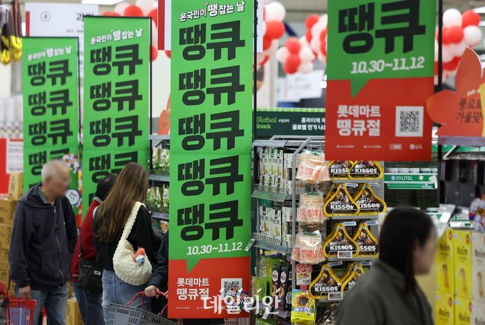 서울 중구 롯데마트 제타플렉스 서울역점에 그랜드 페스티벌 연계 롯데마트 땡큐절 행사가 안내되고 있다.ⓒ뉴시스