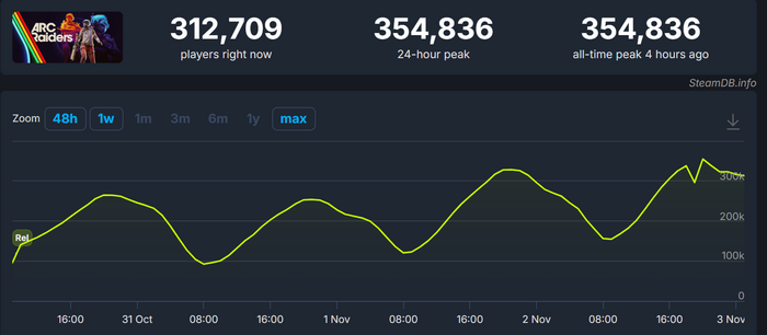 3일 글로벌 대표 PC 플랫폼 스팀 DB에 따르면, 아크 레이더스는 지난 24시간 동안 최고 동시접속자 35만4836명을 달성했다. 스팀 트렌딩 게임 리스트에서도 1위에 올랐다. 에픽스토어(PC)와 콘솔(플레이스테이션, 엑스박스, 지포스 나우)까지 포함할 경우 최고 동시접속자는 이를 크게 상회할 것으로 추정된다.