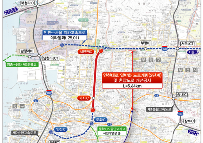 인천대로 일반화 2단계 사업은 주안산단고가교~서인천IC 5.64km 구간을 일반도로와 지하차도로 개량하고 중앙녹지를 조성하는 방식으로 진행되며 2030년 완공이 목표다.