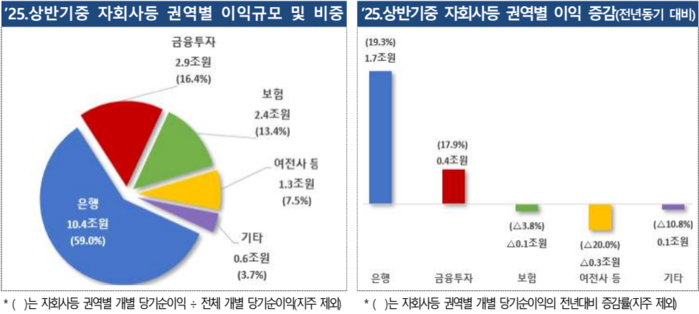 이익 비중을 보면 은행 부문이 59.0%(10조4000억원)로 지난해 같은 기간보다 4.6%포인트(p) 상승했다. 금융투자는 16.4%(2조9000억원)로 1.1%p 늘었고, 보험은 13.4%(2조4000억원)로 1.9%p 감소했다. 여전사는 7.5%(1조3000억원)로 2.8%p 줄었다.