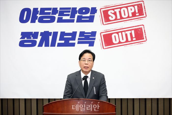 송언석 국민의힘 원내대표가 4일 오전 서울 여의도 국회에서 열린 국민의힘 의원총회에서 발언을 하고 있다.