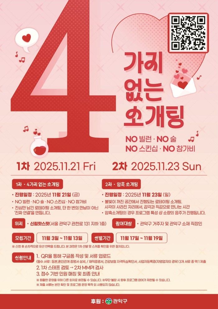 서울 관악구(구청장 박준희)가 오는 21일(금)과 23일(일), 직장인 1인가구를 위한 색다른 소개팅 프로그램을 개최한다고 4일 밝혔다.