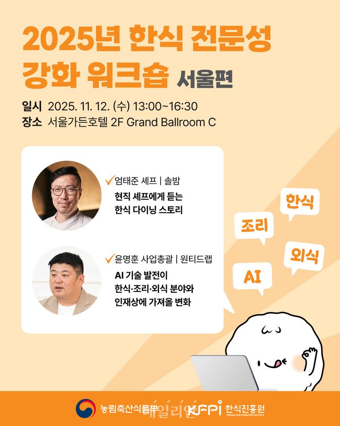 서울 워크숍은 11월 12일 서울가든호텔에서 열리며, 엄태준 셰프(솔밤)가 ‘현직 셰프에게 듣는 한식 다이닝 스토리’를, 윤명훈 원티드랩 사업총괄이 ‘AI 기술 발전이 한식·조리·외식 분야와 인재상에 가져올 변화’를 주제로 강연한다.