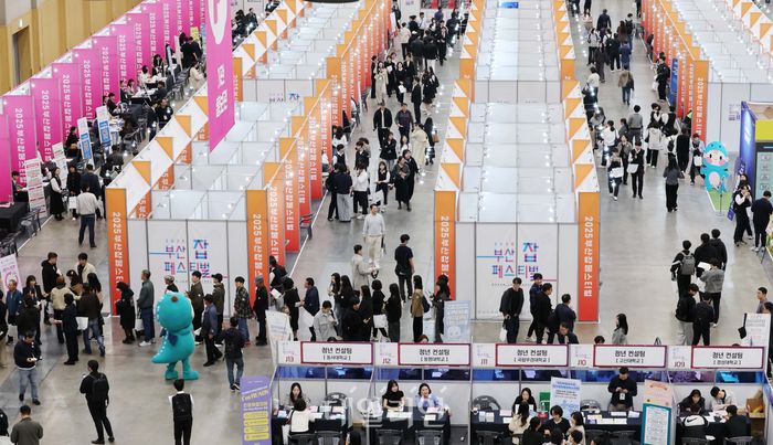 '2025 부산 잡(JOB) 페스티벌'이 열린 지난달 27일 부산 해운대구 벡스코 제1전시장에서 구직자들이 구인업체 부스에서 현장면접을 보거나 채용상담을 하고 있다. ⓒ뉴시스
