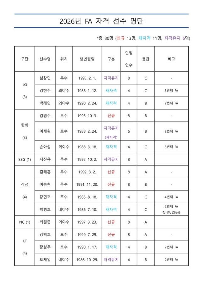 2026년 FA 자격 선수는 총 30명이다. FA 등급 별로는 A등급 7명, B등급 13명, C등급 10명이다. 이 중 처음 FA 자격을 얻은 선수가 13명, 재자격 선수는 11명, 이미 FA 자격을 취득했지만 FA 승인 신청을 하지 않고 자격을 유지한 선수는 6명이다.