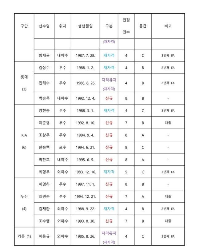 또한 비FA 다년 계약 체결 선수 및 기존 FA 선수 중 계약 기간 연장 옵션 발동 등으로 FA 자격 요건을 신규 취득 또는 재취득했으나 올해 계약 기간이 종료되지 않은 ‘FA계약 유보선수’ 14명도 함께 공시했다.