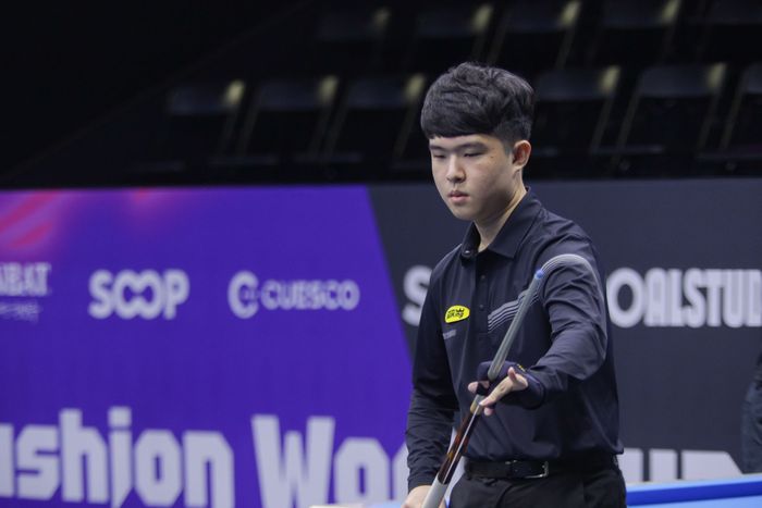 2025 광주 세계3쿠션당구월드컵에 나선 한국의 10대 유망주 김도현(17·상동고부설방통고)이 다음 공을 어떻게 칠지 구상하고 있다.