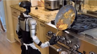 휴머노이드(인간형) 로봇이 볶음 요리를 시도하다 음식물을 바닥에 쏟고 미끄러지는 영상이 180만회 이상 조회되며 화제를 모으고 있다.