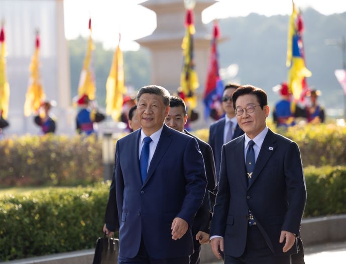 이재명 대통령과 시진핑 중국 국가주석이 1일 경북 경주박물관에서 공식 환영식을 마친 뒤 정상회담을 하기 위해 도보로 이동하고 있다.ⓒ대통령실 제공