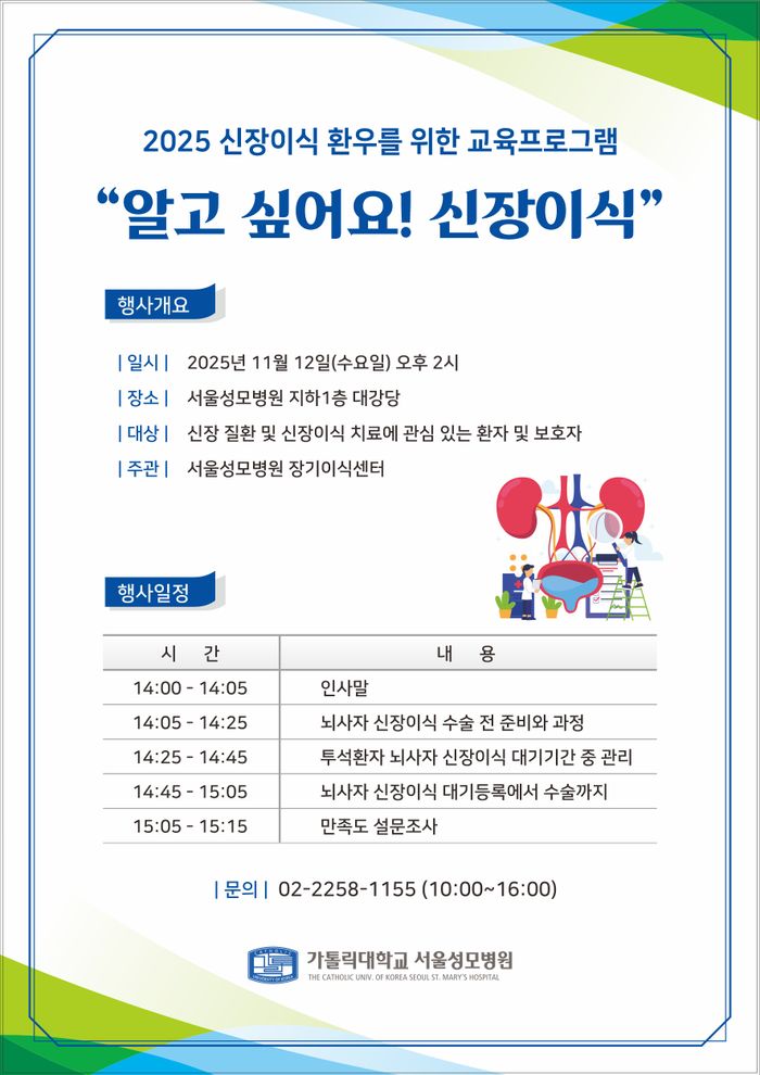 가톨릭대학교 서울성모병원 장기이식센터는 오는 12일 본관 지하 1층 대강당에서 2025 신장이식 환우를 위한 교육프로그램 ‘알고 싶어요! 신장이식’을 개최한다고 5일 밝혔다.