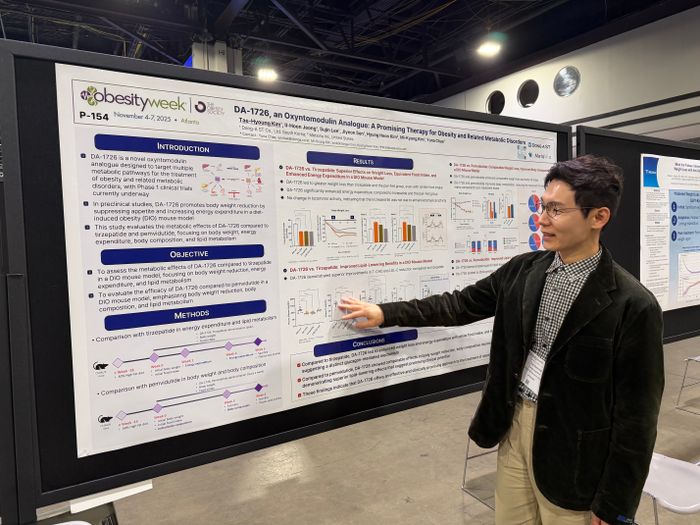 이번 학회에서 새롭게 공개된 전임상 연구는 고지방 식이 유도 비만(DIO) 마우스 모델을 대상으로 진행됐다. DA-1726은 식욕 억제와 에너지 소비 증가를 통해 체중 감소를 촉진했다.