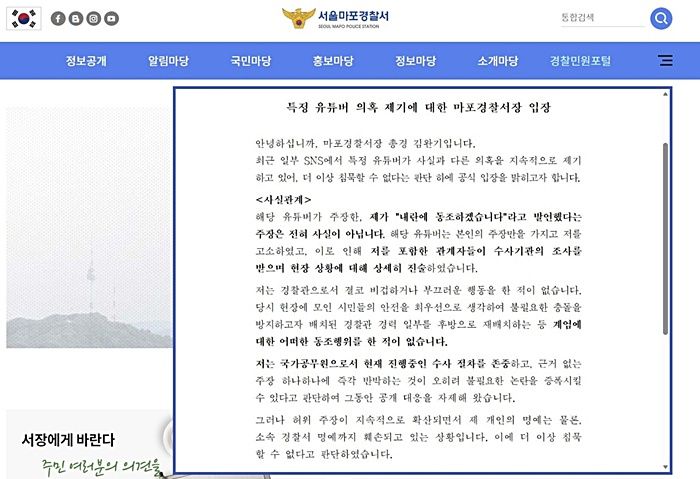 김 서장은 5일 서울 마포경찰서 홈페이지 메인 화면 및 공지사항을 통해 발표한 입장문에서 "허위 주장이 지속적으로 확산되면서 개인의 명예는 물론, 소속 경찰서 명예까지 훼손되고 있는 상황"이라며 이같이 밝혔다.
