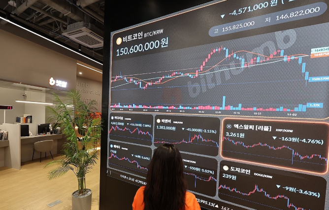 5일 서울 강남구 빗썸 라운지 전광판에 비트코인 시세가 표시돼있다. ⓒ연합뉴스