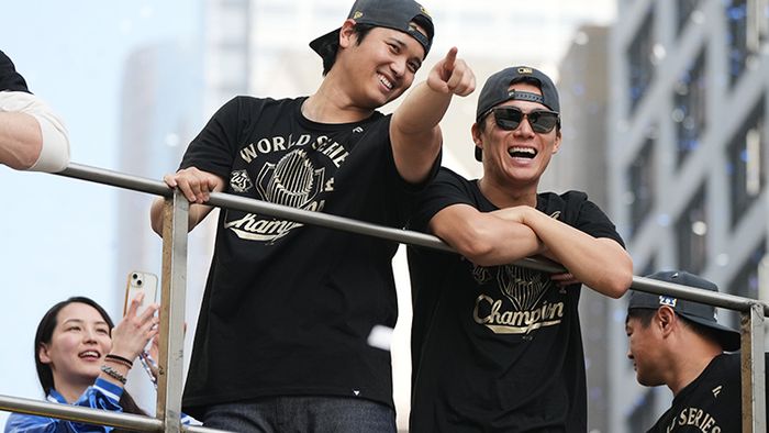 지난 3일(현지시간) LA 다저스 구단 선수들은 LA에서 월드시리즈 2연패 달성 기념 카퍼레이드를 벌였다. 이날 퍼레이드 차량에는 다나카도 함께 올라 축제를 즐겼다.