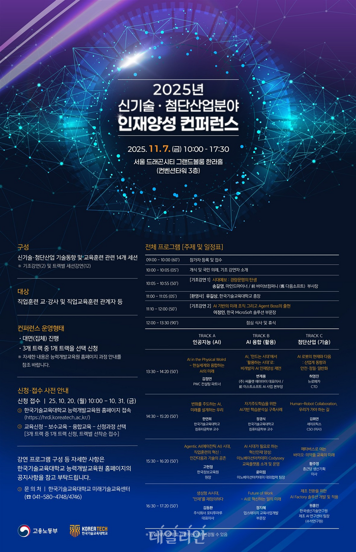 한국기술교육대학교는 7일 서울드래곤시티 한라홀에서 직업훈련 교·강사 및 직업교육훈련 관계자 350여명이 참석한 가운데 ‘2025 신기술·첨단산업분야 인재양성 콘퍼런스’를 성료했다.