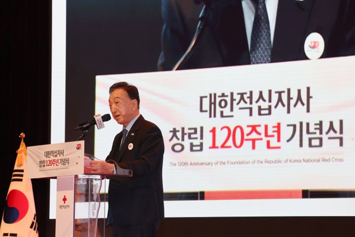 김철수 대한적십자사 회장이 지난달 27일 서울 강남구 코엑스에서 열린 '대한적십자사 창립 120주년 기념식'에서 기념사를 하고 있다. ⓒ연합뉴스