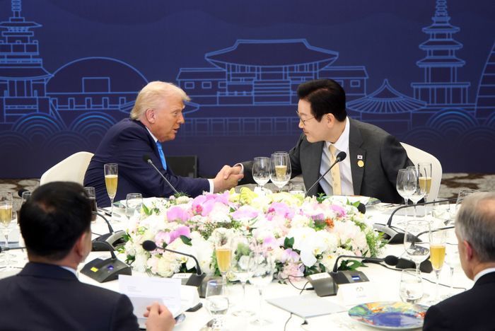 이재명 대통령이 10월 29일 경북 경주 힐튼호텔 그랜드볼룸에서 열린 대통령 주최 정상 특별만찬에서 도널드 트럼프 미국 대통령과 악수하고 있다. ⓒ뉴시스