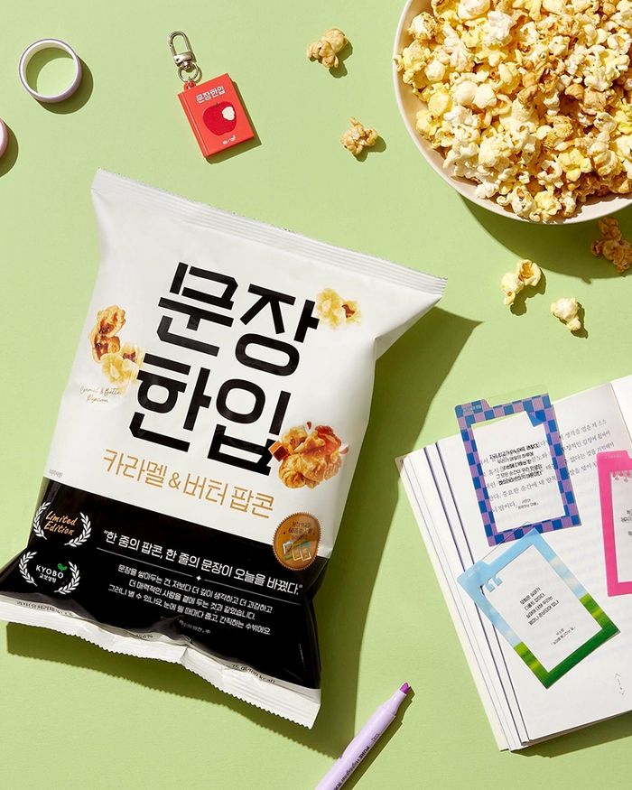 문장 한입 팝콘은 달콤한 카라멜 팝콘과 고소한 버터 팝콘이 반반 구성됐으며, 책갈피 굿즈가 들어가 있다. 책갈피에는 소설과 에세이에서 발췌한 위로와 힘이 되는 60종의 문장이 랜덤으로 담겨 있어 소장 욕구를 자극한다.
