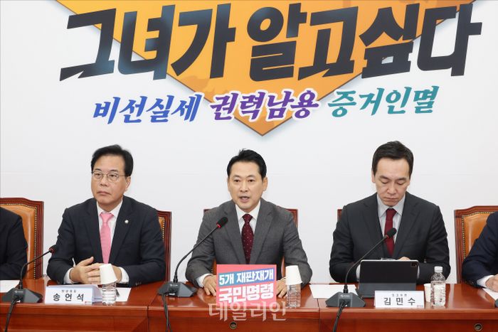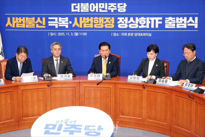 정청래 더불어민주당 대표가 3일 오전 서울 여의도 국회에서 열린 더불어민주당 '사법불신 극복·사법행정 정상화 TF' 출범식에서 모두발언을 하고 있다.