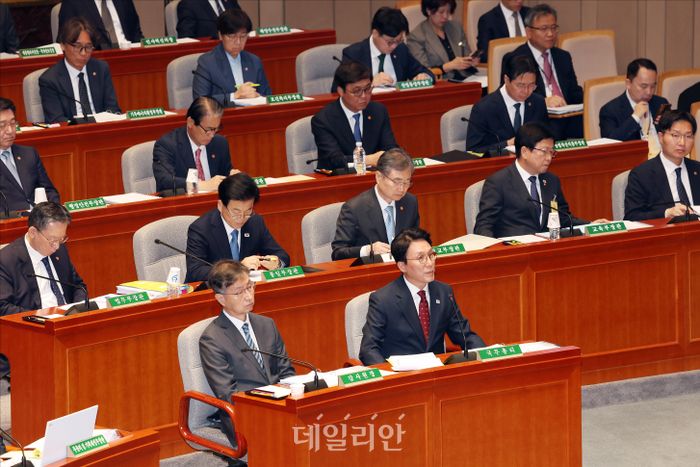 김민석 국무총리를 비롯한 이재명 정부 내각 장관들이 7일 오전 서울 여의도 국회 본청에서 열린 국회 예산결산특별위원회 전체회의에 출석해 종합정책질의를 듣고 있다.