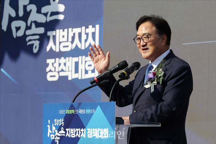 우원식 국회의장이 7일 오후 서울 여의도 국회 사랑재에서 2025 참좋은 지방자치 정책대회에서 축사를 하고 있다.