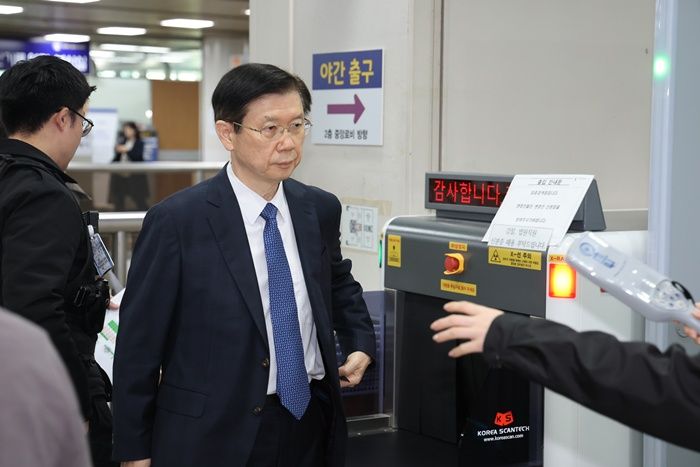 박종준 전 대통령경호처장이 7일 서울 서초구 서울중앙지법에서 열린 윤석열 전 대통령의 특수공무집행방해 등 혐의 속행 공판에 증인으로 출석하며 검색대로 향하고 있다. ⓒ연합뉴스