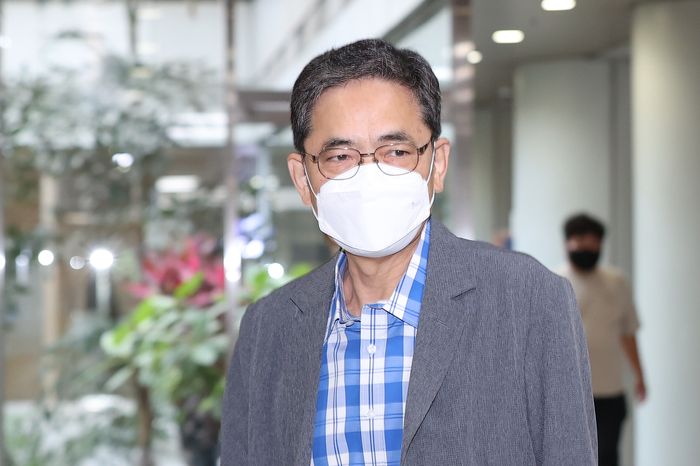 대장동 개발사업에 도움을 주고 뇌물을 수수한 혐의로 기소된 곽상도 전 국민의힘 의원이 24일 오전 서초구 서울중앙지법에서 열리는 1심 속행공판에 출석하고 있다.ⓒ연합뉴스
