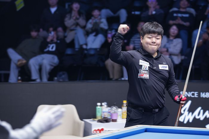 대한민국 조명우(서울시청)가 9일 광주 빛고을체육관에서 열린 ‘2025 광주 3쿠션 월드컵’ 준결승전서 승리를 거둔 뒤 주먹을 불끈 쥐고 있다.