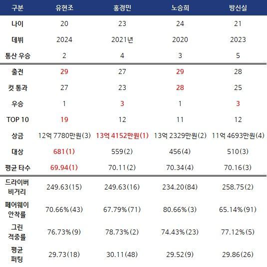 올 시즌의 특징은 절대강자 없이 다수의 선수들이 곳곳에서 강세를 보이며 우승과 각종 타이틀을 나눠 갖는 춘추전국시대였다는 점이다. 특히 상금 10억원을 돌파하며 ‘빅4’를 형성한 유현조, 홍정민, 노승희, 방신실의 활약상이 눈에 띄었다.