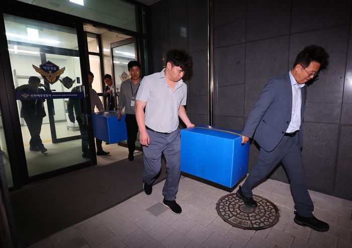 갯벌에 고립된 노인을 혼자서 구하려다가 숨진 해양경찰관 이재석 경사 순직 사고와 관련, 수사 중인 검찰 수사관들이 지난 9월18일 오후 인천 서구 인천해양경찰서 청사 압수수색을 마친 뒤 압수품을 옮기고 있는 모습. ⓒ연합뉴스