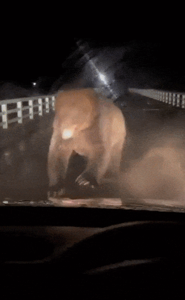 공개된 영상에는 어두운 도로 위에서 갑자기 차량을 향해 달려드는 불곰의 모습이 담겼다. 놀란 운전자가 급히 후진했지만 곰은 보닛을 내리친 뒤에도 계속 쫓아오는 등 위협적인 행동을 이어갔다.