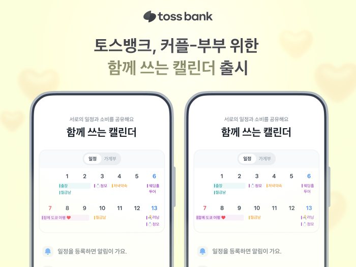 토스뱅크는 커플과 부부가 서로의 일정을 공유하고 소비 내역을 함께 기록할 수 있는 ‘함께 쓰는 캘린더’ 서비스를 새롭게 선보였다고 11일 밝혔다.