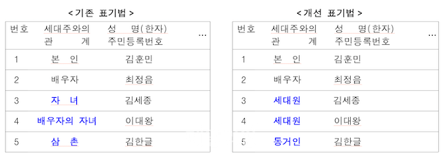 개정안에는 가족관계 표기 개선을 통해 재혼가정의 사생활 노출을 방지한다. 앞으로는 등·초본에서 세대주와의 관계를 표시할 때 세대주의 배우자 외 가족(부모, 자녀, 형제자매 등)은 ‘세대원’, 그 외의 구성원은 ‘동거인’으로 표기된다.