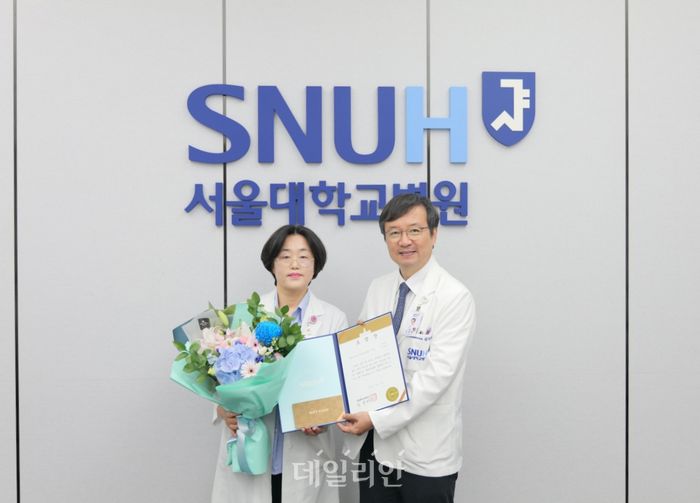 김영태 서울대병원장(오른쪽)이 안선미 서울대병원 간호사에게 칭찬 릴레이 프로그램 표창장을 전달하고 있다. ⓒ안선미 간호사