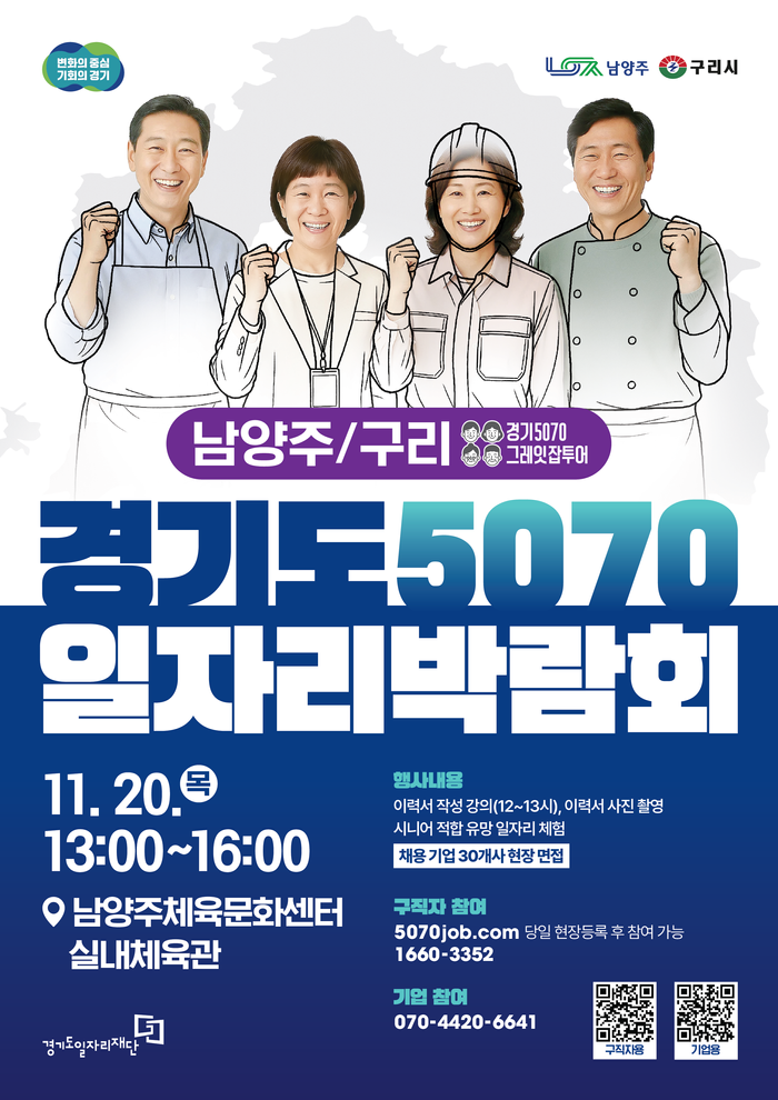 ‘경기도 5070 일자리박람회’는 도내 중장년 구직자의 재취업을 지원하는 ‘경기 5070 그레잇잡투어(Gray it-job tour)’의 하나다. 남양주일자리센터, 남양주시니어클럽 등 지역 일자리 유관기관과 협력해 5070세대 구직자에게 맞춤형 취업 기회를 제공할 계획이다.