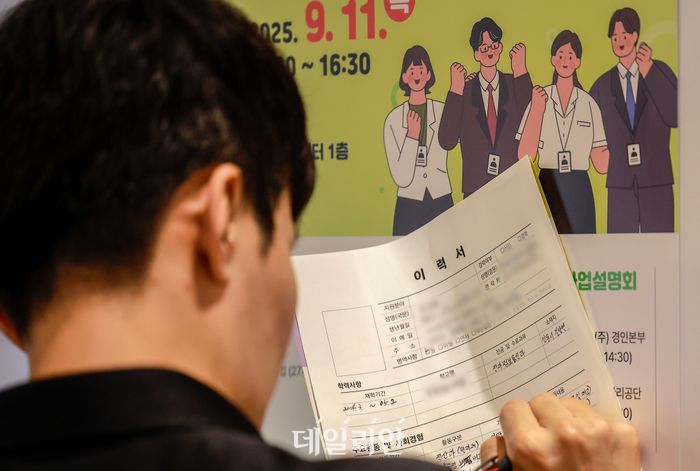 지난 9월 11일 서울 영등포구 FKI타워에서 열린 희망 업 취업박람회를 찾은 구직자가 이력서를 작성하고 있다. ⓒ뉴시스