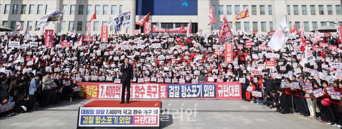 장동혁 국민의힘 대표가 12일 오전 서울 여의도 국회 본청 앞 계단에서 열린 국민의힘 '대장동 일당 7400억 국고 환수 촉구 및 검찰 항소포기 외압 규탄대회'에서 발언을 하고 있다.