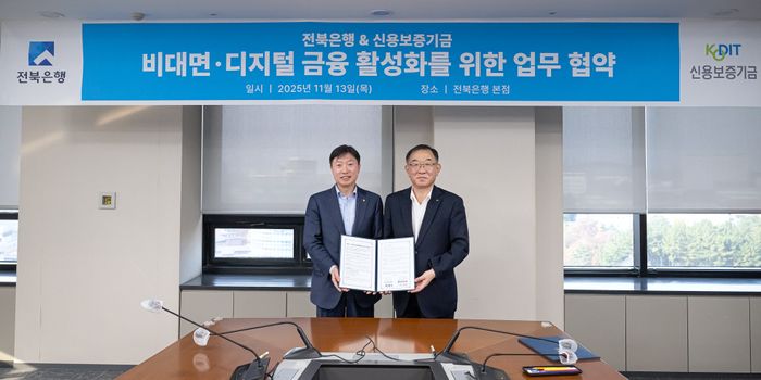 JB금융그룹 전북은행은 신용보증기금과 함께 중소기업 및 소상공인 지원 강화를 위해 '비대면·디지털 금융 활성화를 위한 업무협약'을 체결했다고 13일 밝혔다.