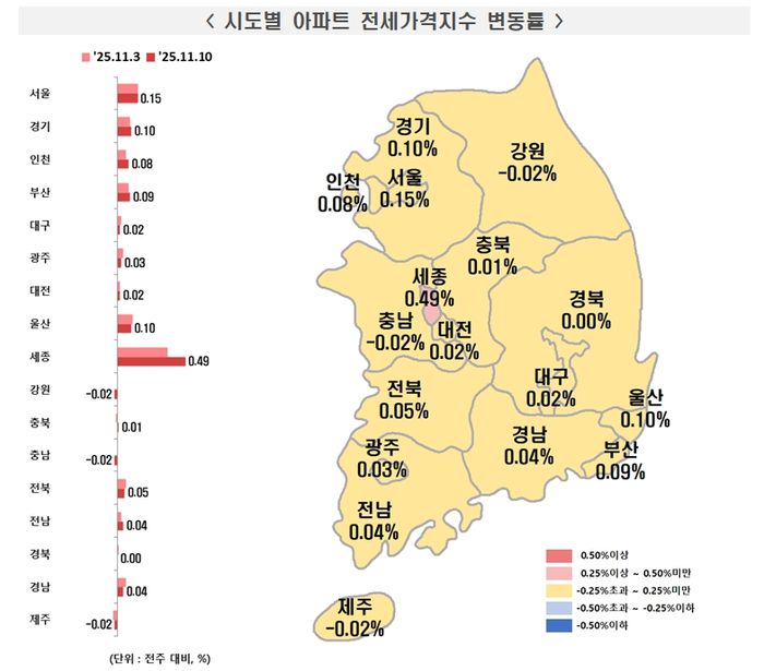 인천의 아파트 전세가격은 0.08%, 경기는 0.10% 각각 상승했다. 지방에선 5대 광역시가 0.06%, 세종이 0.49%, 8개도 0.01% 등으로 전체적으로 0.04% 상승한 것으로 집계됐다.