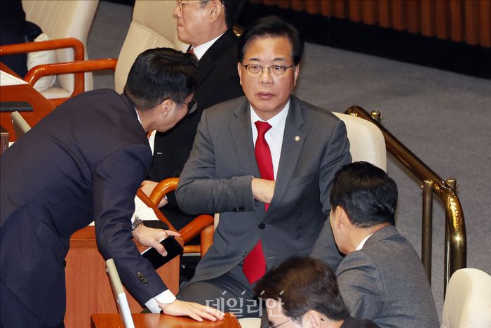 국민의힘 장동혁 대표, 송언석 원내대표 등이 13일 오후 서울 여의도 국회 본청에서 열린 국회 본회의에서 대화를 하고 있다. ⓒ데일리안 홍금표 기자
