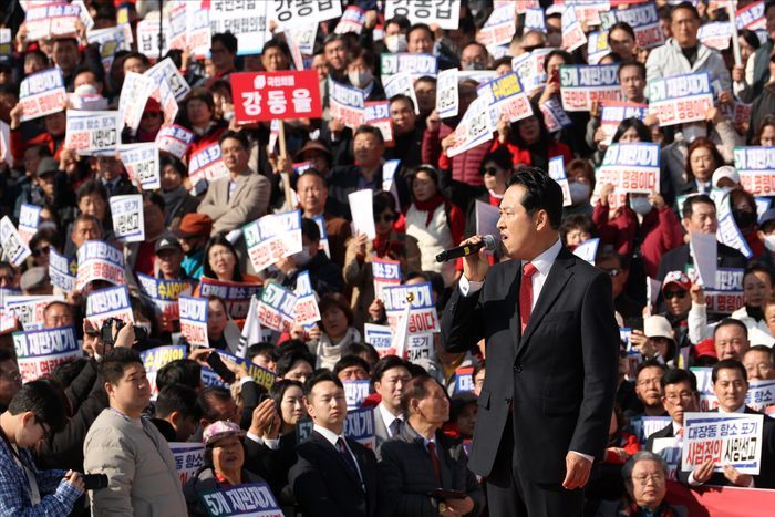 장동혁 국민의힘 대표가 지난 12일 오전 국회본청 앞 계단에서 열린 국민의힘 '대장동 일당 7400억 국고 환수 촉구 및 검찰 항소포기 외압 규탄대회'에서 발언을 하고 있다. ⓒ데일리안 홍금표 기자