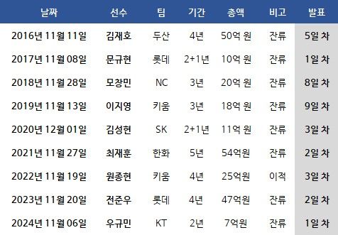 그로부터 지난해까지 9시즌이 지났고 승인 공시 후 하루 만에 계약이 성사된 사례가 2회, 5일 이내 첫 계약자가 나온 횟수 또한 7번이었다. 가장 늦게 첫 계약자가 나왔던 시즌은 2019년 9일 만에 도장을 찍은 키움 이지영이었다.