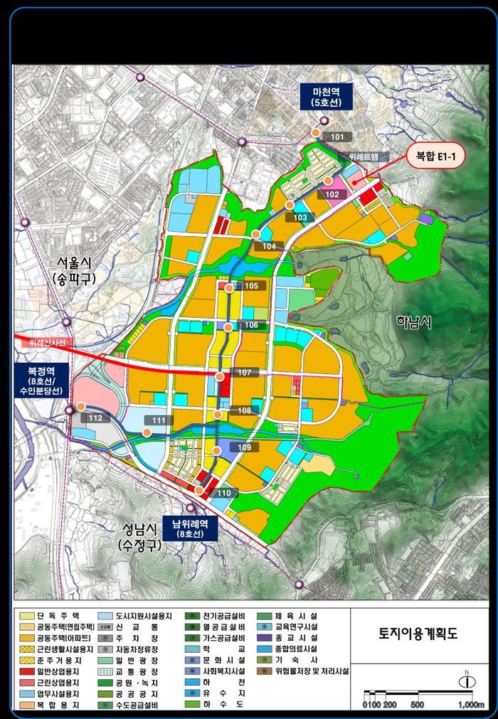 위례지구 복합용지 E1-1은 지구단위계획 변경을 통해 주거부 용적률 상향·전용면적 조정 등 사업성을 개선해 재분양하는 토지다. 연초부터 문의가 지속된 인기 필지다.