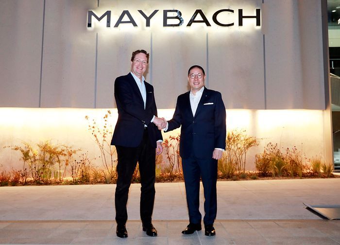 올라 칼레니우스 메르세데스-벤츠 그룹 AG 최고경영자(CEO)와 조현상 HS효성 부회장이 마이바흐 브랜드센터 서울에서 기념 촬영을 하고 있다. ⓒ메르세데스-벤츠