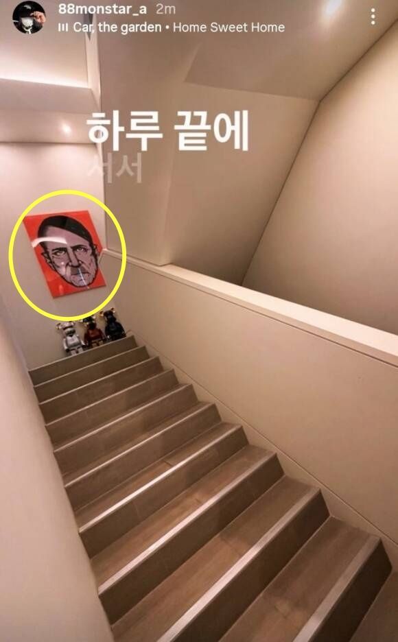 가수 MC몽이 최근 자신의 SNS에 집 내부를 촬영한 영상을 공개한 가운데, 계단 끝 벽면에 히틀러를 연상시키는 그림이 걸려있어 역사 의식이 부족하다는 비판을 받았다. 이에 MC몽은 “작품은 작품으로 이해해 달라”고 11일 입장을 밝혔다. 이어 “(작품은) 빨대로 색을 표현해 욕심과 이기심, 누군가의 피를 빨아먹는 사람의 야만을 표현한 것”이라고 설명했다.