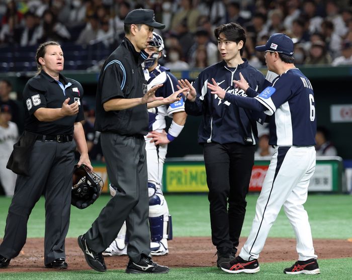 15일 일본 도쿄돔에서 열린 2025 K베이스볼 시리즈 대한민국과 일본의 평가전. 류지현 감독이 그라운드에 나와 심판진에게 어필하고 있다. ⓒ 연합뉴스