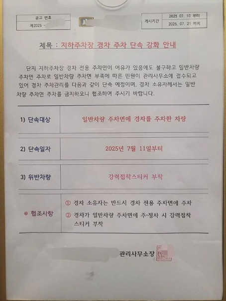 관리사무소 측은 "경차 전용 주차면이 여유가 있음에도 일반차량 주차면 주차로 일반차량 주차면 부족에 따른 민원이 접수되고 있다"며 "경차 소유자는 일반 차량 주차면에 주차하지 말라"고 요청했다. 심지어 위반차량에는 강력 접착 스티커를 부착하겠다고 경고하기도 했다.