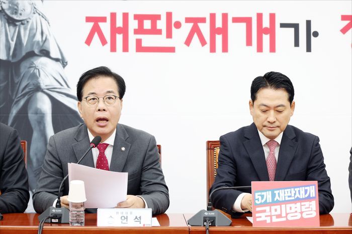 송언석 원내대표는 17일 서울 국회에서 열린 최고위원회의에서 "재판중지법이라 하지말고 '국정안정법'이라고 하라. 새벽배송이라 하지 말고 '초심야 배송'이라 하라. '항소 포기'라 하지 말고 '항소 자제'라고 하라. 해명 요구라 하지말고 '항명'이라고 하라. 조작·입틀막·독재의 달인 이재명 정권은 급기야 소위 '헌법파괴 내란몰이'를 '헌법존중 정부혁신'이라고 부르라고 한다"고 목소리를 높였다.