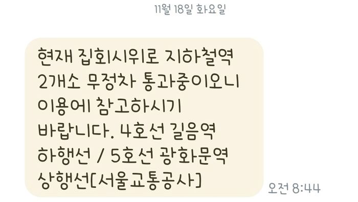 18일 오전 서울교통공사는 "현재 집회시위로 지하철역 2개소 무정차 통과 중이오니 이용에 참고하시기 바랍니다. 4호선 길음역 하행선/ 5호선 광화문역 상행선"이라는 재난문자를 보냈다.